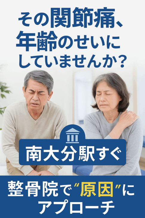関節の痛み「膝が痛くて階段の上り下りがつらい…」「肩の関節が動かしにくい」「歩くたびに足首が痛む」 このような関節痛に悩まされていませんか?とくに南大分駅周辺にお住まいの方で、病院では湿布や薬だけ、でも良くならない…という方は、ぜ...